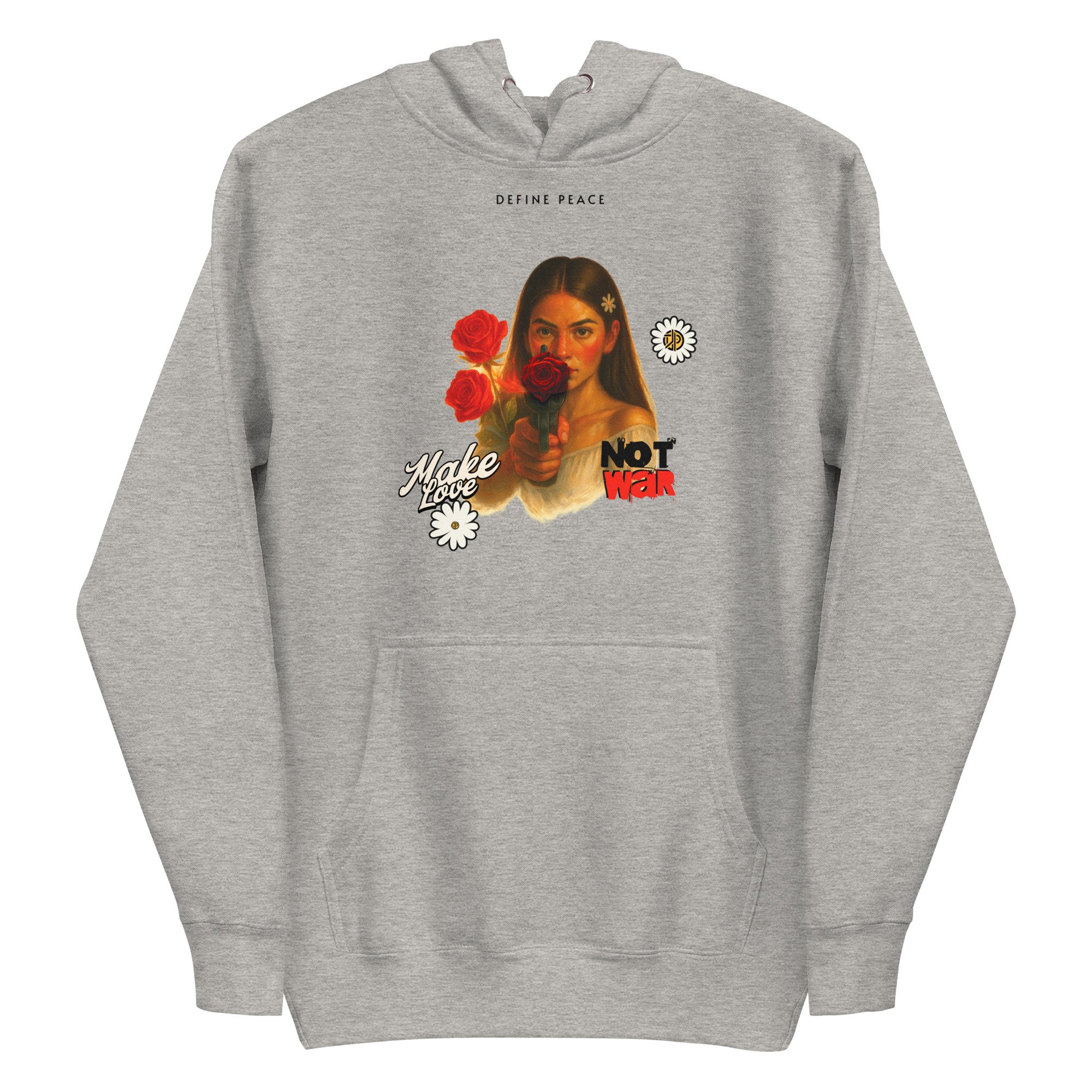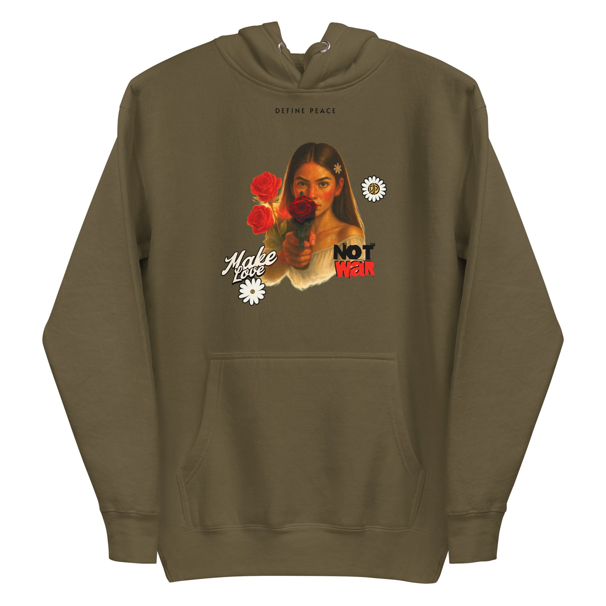 “Make Love, Not War” wraps around the art in bold typography, backed by daisies and strength. The Define Peace® logo is stamped like a seal of intent: